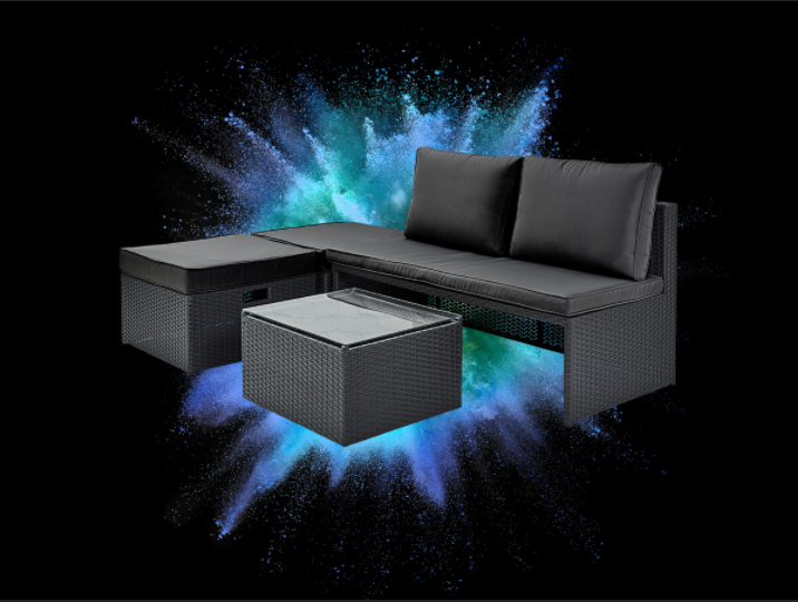 售价299澳元的户外组合式休闲会所,可以在露台或花园招待朋友或家人,配有两个座椅休闲会所、一张咖啡桌和两个脚垫。