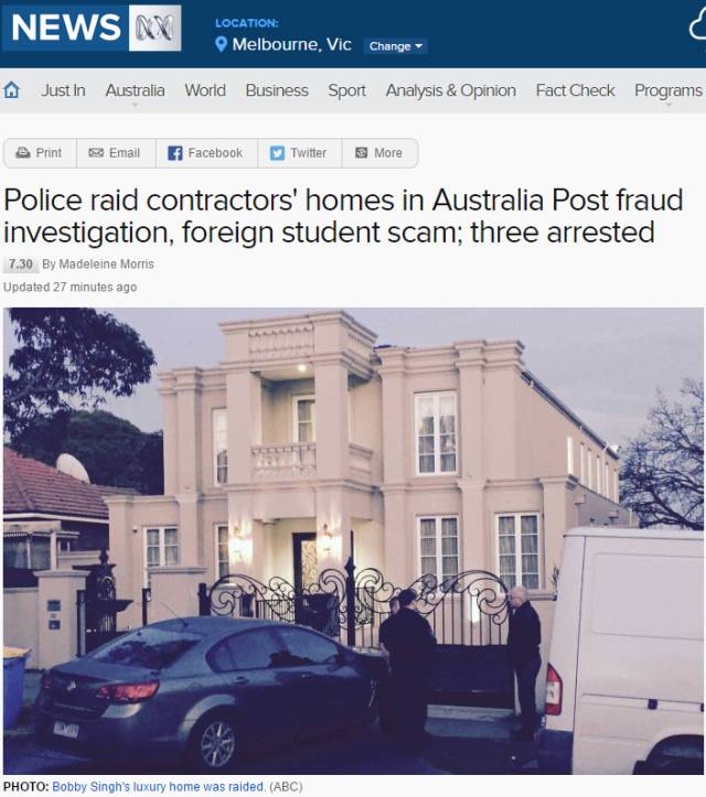 据澳大利亚广播公司(ABC)报道,澳大利亚邮局所聘劳工公司的3名经营者已经被警方拘捕。联邦警察将指陈,这3名男子还经营2间培训学院,他们利用这些培训学院以虚假手段为印度留学生获取学生签证。他们向留学生收取高达1万元的费用,但并不提供正当的培训。