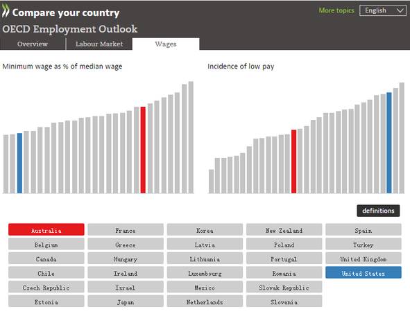 从图中薪资对比可看出,澳大利亚低收入人群占比15.8%,美国到达25%;澳大利亚的最低工资占平均收入的54%,美国只占37.4%。美国贫富差距远大于澳大利亚,在澳大利亚生活的幸福指数要高出很多。