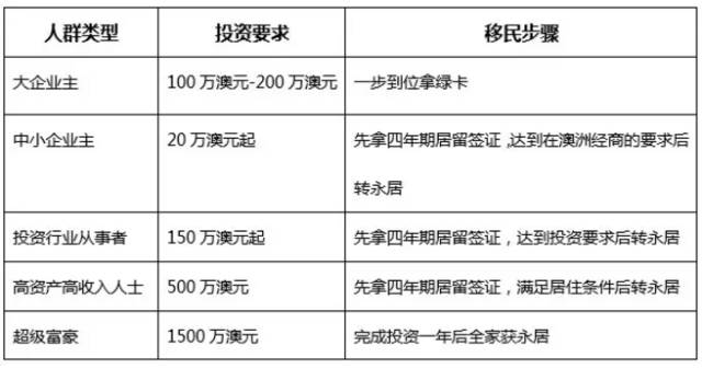 澳大利亚政府非常欢迎中国的成功商业人士赴澳投资安家,因此针对不同类型的人士“定制”了不同的移民政策。不管是大型企业上市公司股东、中小企业主、专业投资人士,亦或是没有商业背景但是资产雄厚的超级富豪,都能找到适合自己的移民澳大利亚途径。