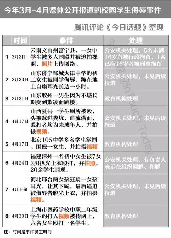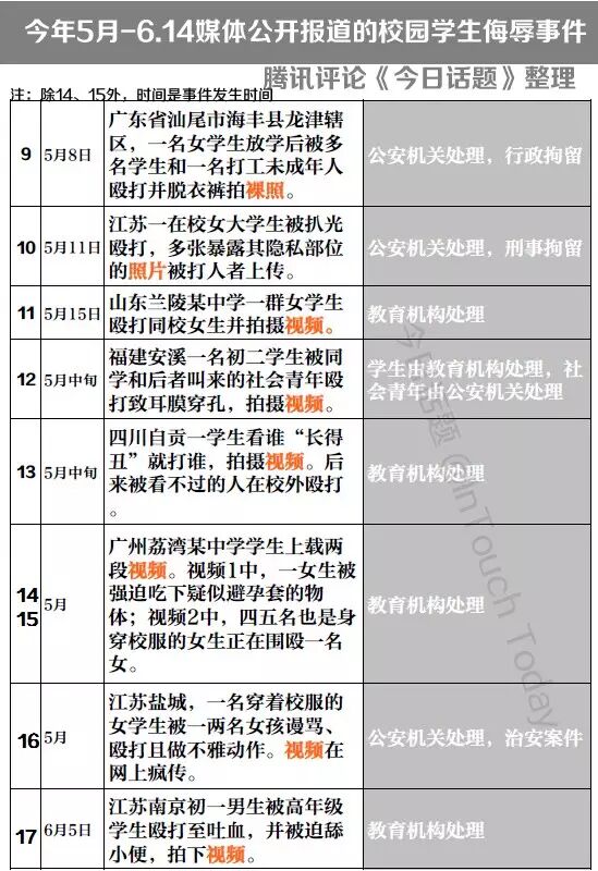 中国的校园欺凌研究起步非常晚,几乎没有整体研究,也缺乏统计工具。可是,不去研究发现,不等于能视而不见。三个半月有17起严重侮辱事件,说触目惊心不为过。请看下图最近报道的校园侮辱事件: