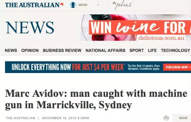 法庭文件显示,警方称周三下午在Marrickville逮捕Avidov时,在他的包里找到一把Thompson牌全自动冲锋枪。他还带着44发12号霰弹和148发22口径子弹。