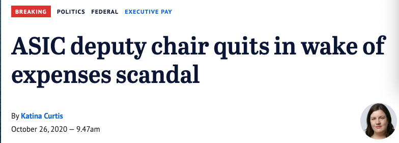 最近澳洲证券及投资委员会(ASIC)的高官惹祸上身,最终引咎辞职。随后队友被连累突然卸职。