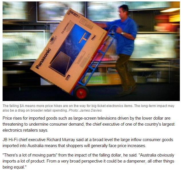 澳洲最大的电子产品零售商之一JB Hi-Fi的执行长说,澳币贬值导致的大屏彩电等进口商品涨价,正在削弱消费者需求。