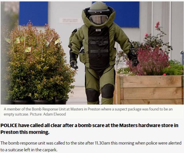 8月3日上午,警察被叫到了Preston的五金店,同时拆弹专员组也在今天上午11:30 到达了Preston,由于停车场发现的可疑手提箱内可能藏有炸弹。