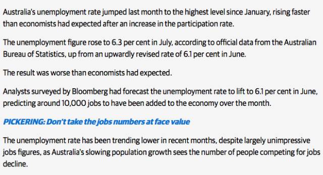 据澳大利亚统计局官方数据显示,澳洲失业率在7月份上升至6.3%(6月为6.1%)。这个结果比经济学家们预测的还要糟糕。央行有可能进一步降息来刺激经济,澳元面对更大的下行压力,奔向60几美分指日可待。