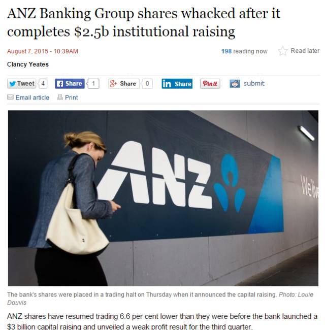 由于银行股遭受打击,澳股200种指数最低下跌了120点,即2.2%,报5535.3点。ANZ股票暴8.5%,难道澳洲也要股灾了吗?澳洲经济要步入长期低迷吗?