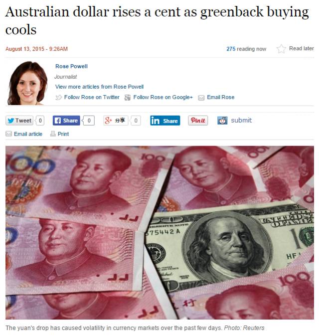 同时,美元的贬值(平均币值下降1美分)也助燃了澳币。美联储即将施行的利率提升计划会被推迟,因为人民币的贬值带来了太多的变动性。