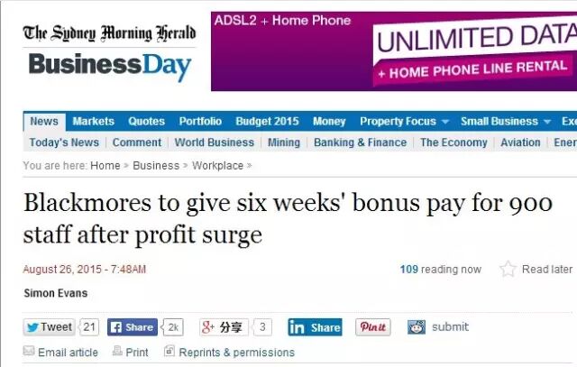 因此,Blackmores的老板决定,将给予900名员工额外的六周的工资奖励,这项奖金是该公司利润分享计划的一部分。被澳洲主流媒体评为澳洲上市公司最给力的老板。