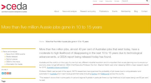 同一个月,澳洲经济发展委员会(CEDA)发布的一份报告显示,40%的澳洲劳动力,即超过500万人,可能会在同一时间段内被自动化所取代。还有18%的工作也有“中等风险”。