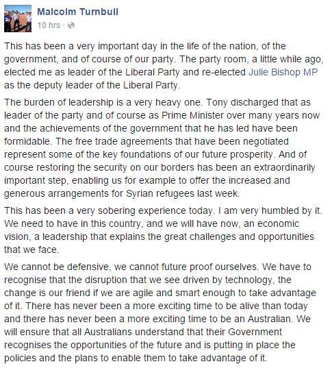 他说:“作为一个活着的人,从来没有过如此让人激动人心的时刻,作为一位澳大利亚人,也从来没有如此激动人心的时刻。我们党内的文化将成为咨询性的,传统的核心内阁制政府,保证决定以合作的方式做出。”