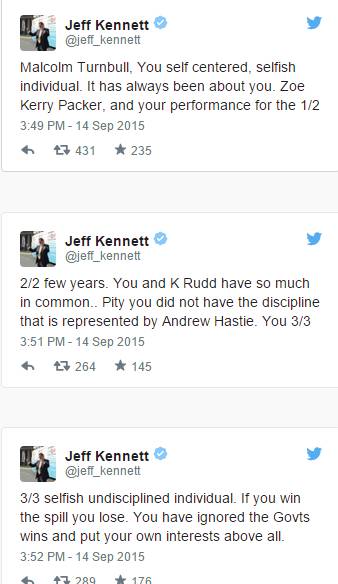 “谭保的做法就是极端不忠诚、极端自负,毋庸置疑,他就是自由党的陆克文。”肯内特告诉ABCNews 24。