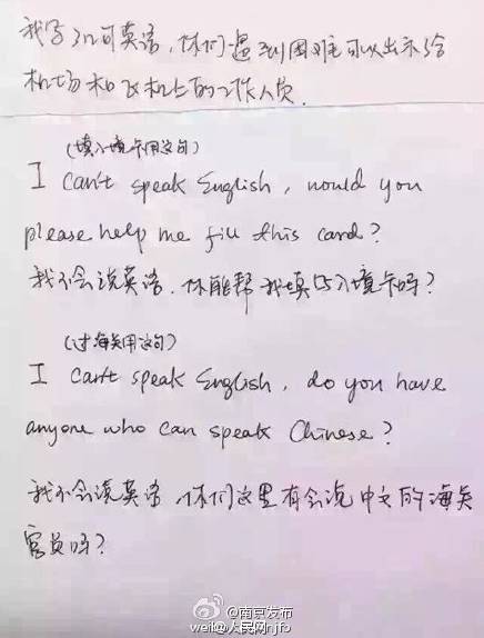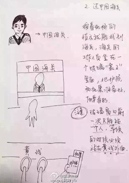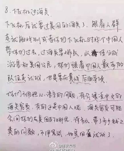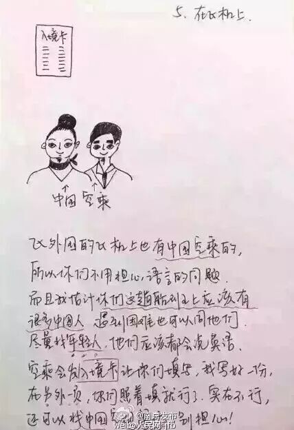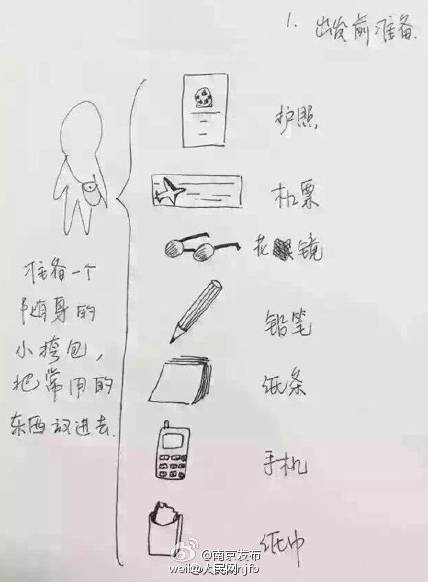 10月9日,南京市委宣传部新闻发布官方微博转发一组图片,很是让人感动。事情是这样的,两位年近六旬的老人,不会英语,没出过国,为了中秋节与女儿团聚,看望刚刚出生的外孙,不远万里赶赴美国。细心的女儿就连写带画地做了一份出境入境攻略,细致入微并且图文并茂,每一笔都渗透着浓浓的亲情~小编看的也是眼泪汪汪的……