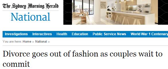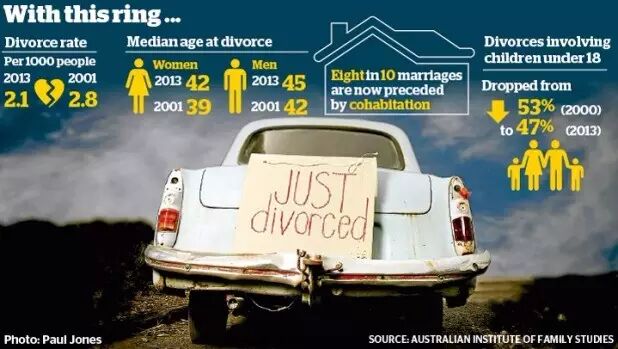 据《悉尼先驱晨报》报道,澳人结婚更谨慎,离婚也减少了。据澳洲家庭研究 (Australian Institute of Family Studies)的统计数据显示,澳洲的离婚率减少了,从2001年的每千人就有2.8人离婚减至2013年的2.1。尤其是2540岁的澳人,离婚率下降明显。