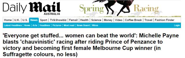 Michelle Payne成为了赢得澳洲这一盛事的首位女骑师,造就了墨杯的一大新亮点。她告知了全世界,这场比赛的胜利对于她本人以及在赛马行业中拼搏的女骑师来说意义重大。