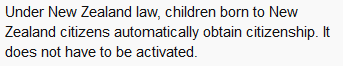 根据新西兰的法律,新西兰公民的后代无论在哪出生都自动成为新西兰公民。