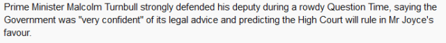 澳大利亚总理谭宝对此立场强硬,称澳大利亚政府对其律师非常有信心,同时预期最高法院的判决对Joyce有利,让Joyce继续担任议员。