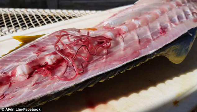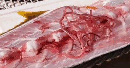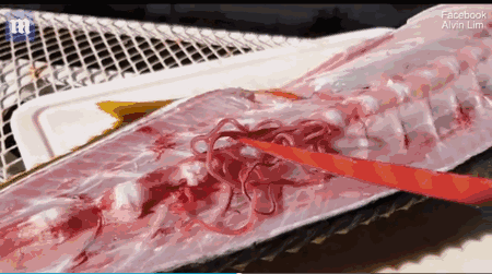 当他想切开鱼,品尝最最新鲜的生鱼片刺身的时候,发现剖开的鱼肉上面有些不一样的小东西在灵活蠕动。