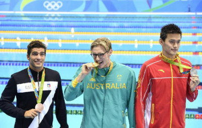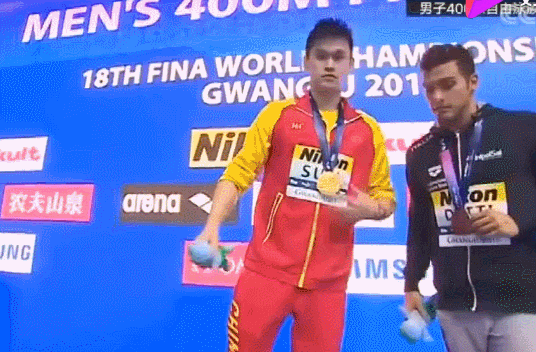 然而,在赛后的颁奖仪式上,当颁奖嘉宾为三位带上不同颜色的奖牌,前三甲选手应该站在一起合影留念时,孙杨右手边的第二名——澳大利亚选手霍顿,却迟迟站在领奖台下不动。