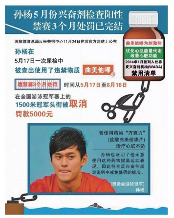 2014年,孙杨因为心肌缺血服用心脏辅助药物,尿检检出违禁成分曲美他嗪,遭到禁赛三个月;