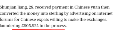 最后被当局发现后,被当地判非法经营货币服务罪,缓刑8个月,外加做160小时的社区志愿者工作,还被罚款80万英镑,近人民币700万元。