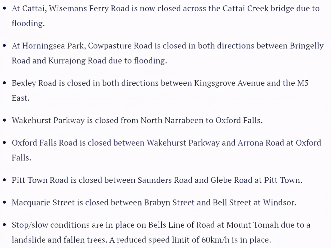 由于洪水的肆意泛滥,新州政府敦促人们避免不必要的出行,如果避无可避,需要听从警方和应急服务部门的指示,绝对不要驾车穿越洪水。