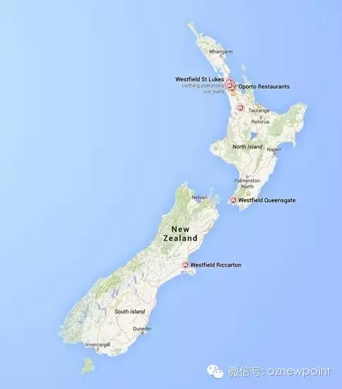 目前,新西兰共有9座Westfield商场,其中包括奥克兰的Albany、Glenfield、ManukauCity、Newmarket、StLukes和WestCity,汉密尔顿的Chartwell,惠灵顿的Queensgate和基督城的Riccarton。