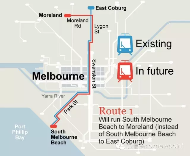 原从South MelbourneBeach开往EastCoburg的1路电车将改道至开往Moreland